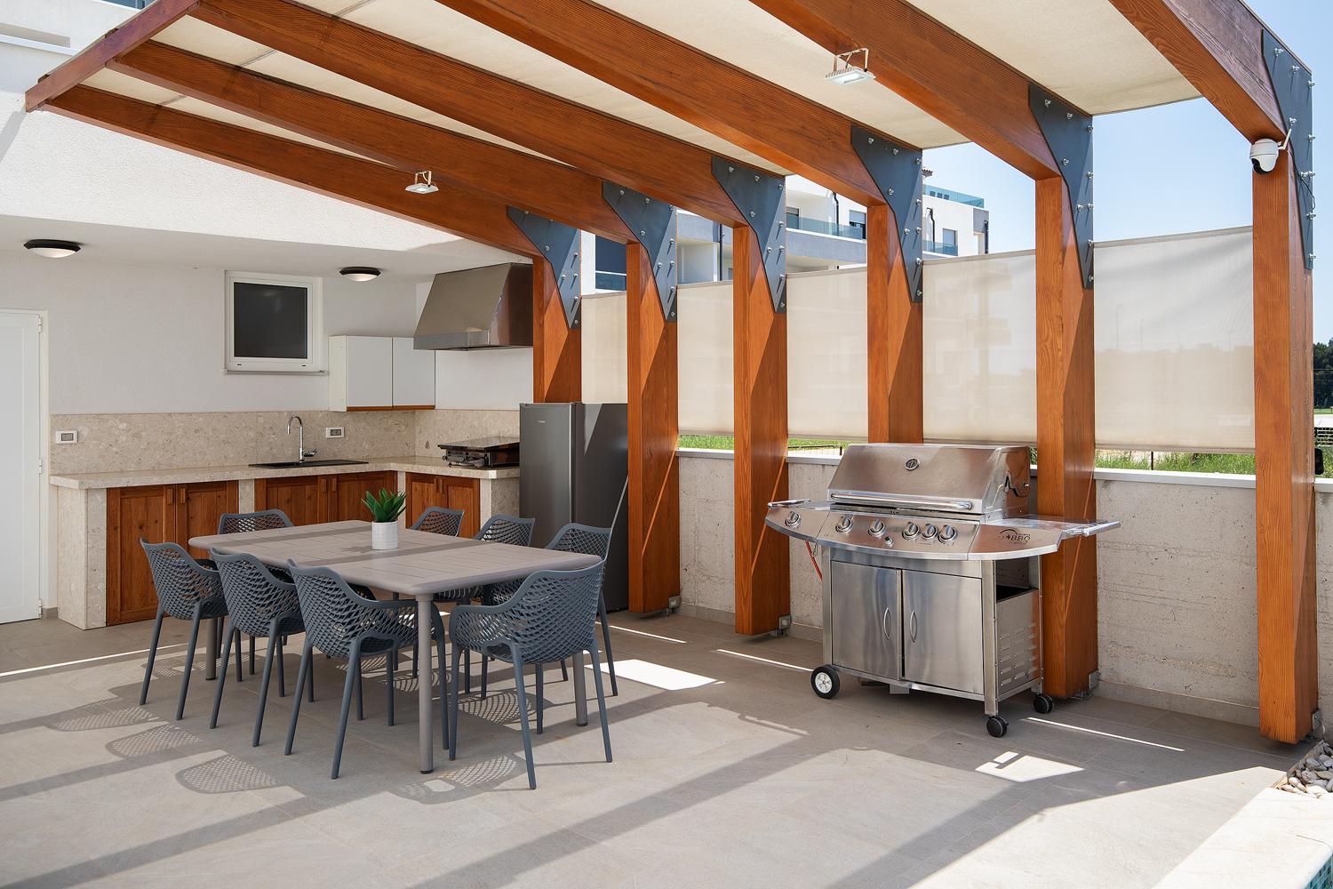 Poolbereich mit Essecke und Outdoorküche