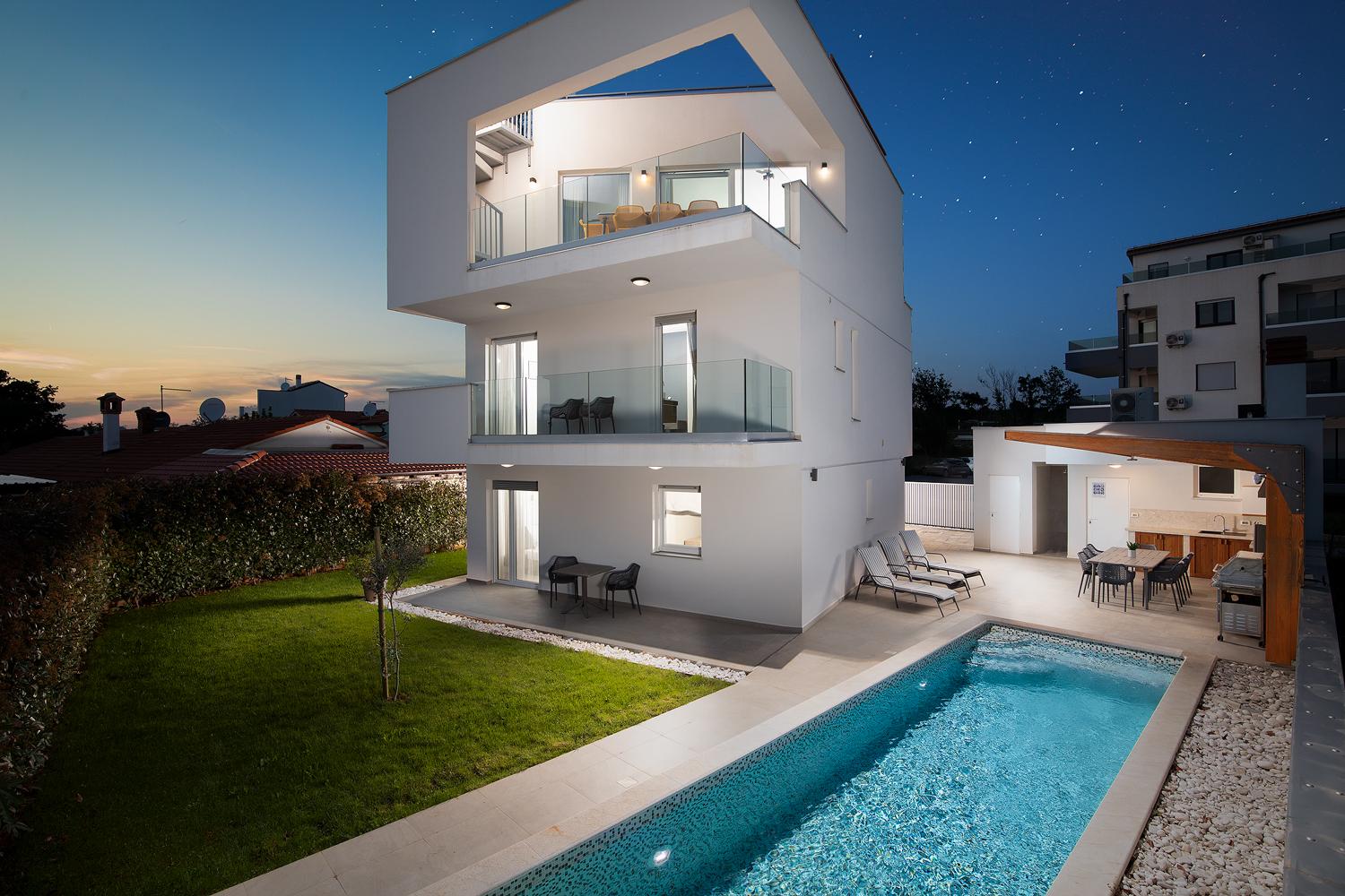 Direkt in Medulin, nur 150 m vom Meer entfernt. Die neu gebaute 5 Sterne Villa verfügt über 4 Schlafzimmer, 5 Badezimmer, eine geräumige Küche und ein Wohnzimmer mit spektakulärem Blick auf den Ort und das Meer.