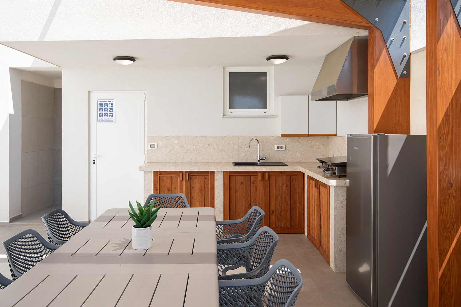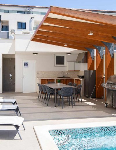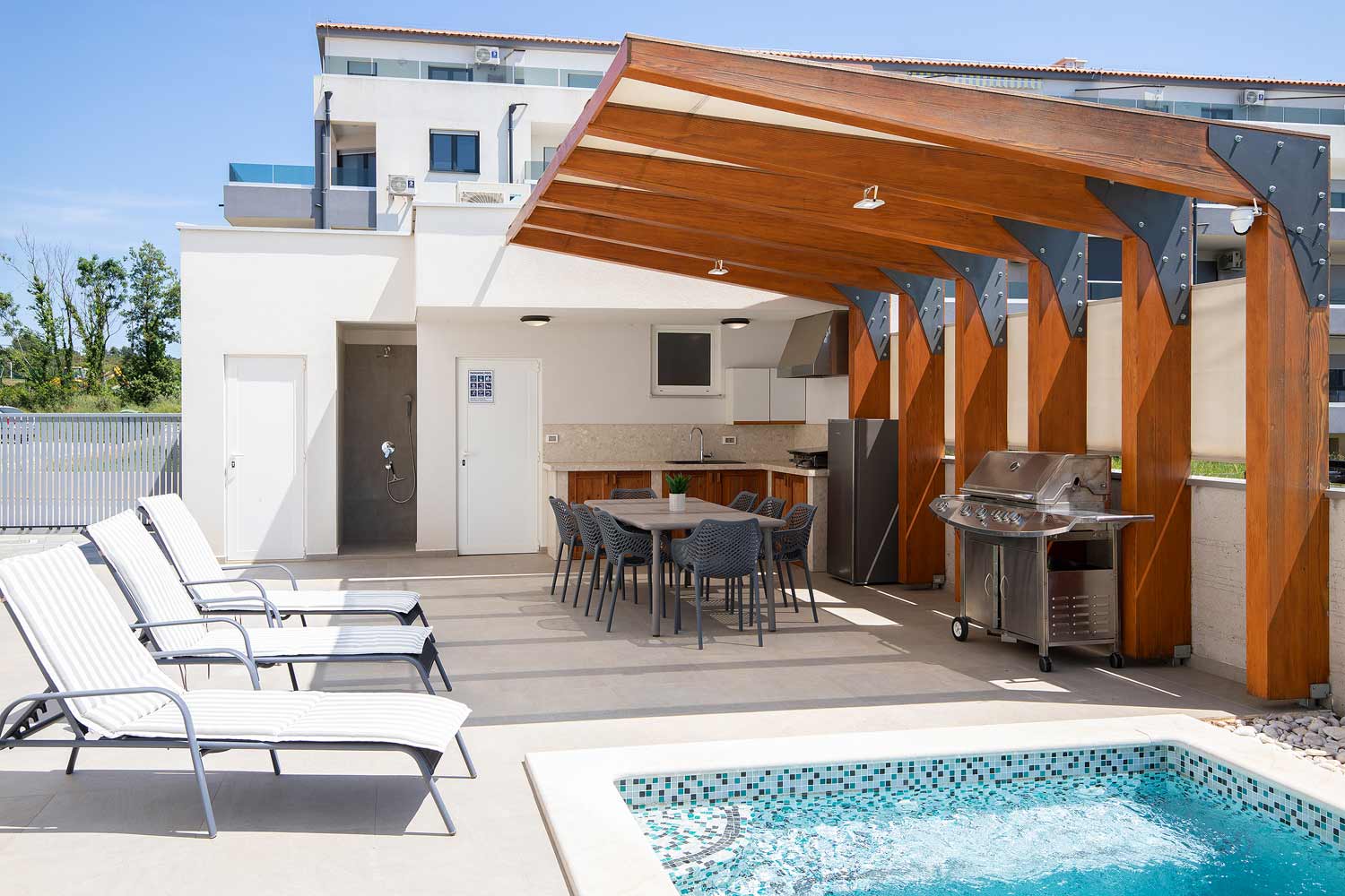 Poolbereich mit Essecke und Outdoorküche