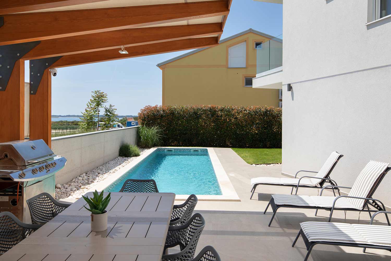 Genießen Sie am Abend Ihren Sundowner mit unvergesslichem Blick auf die Medulin Bay und die vorgelagerten Inseln. Neben dem Haus gibt es ein Pool inkl. voll ausgestatteter Outdoorküche im vollständig eingezäunten Garten.